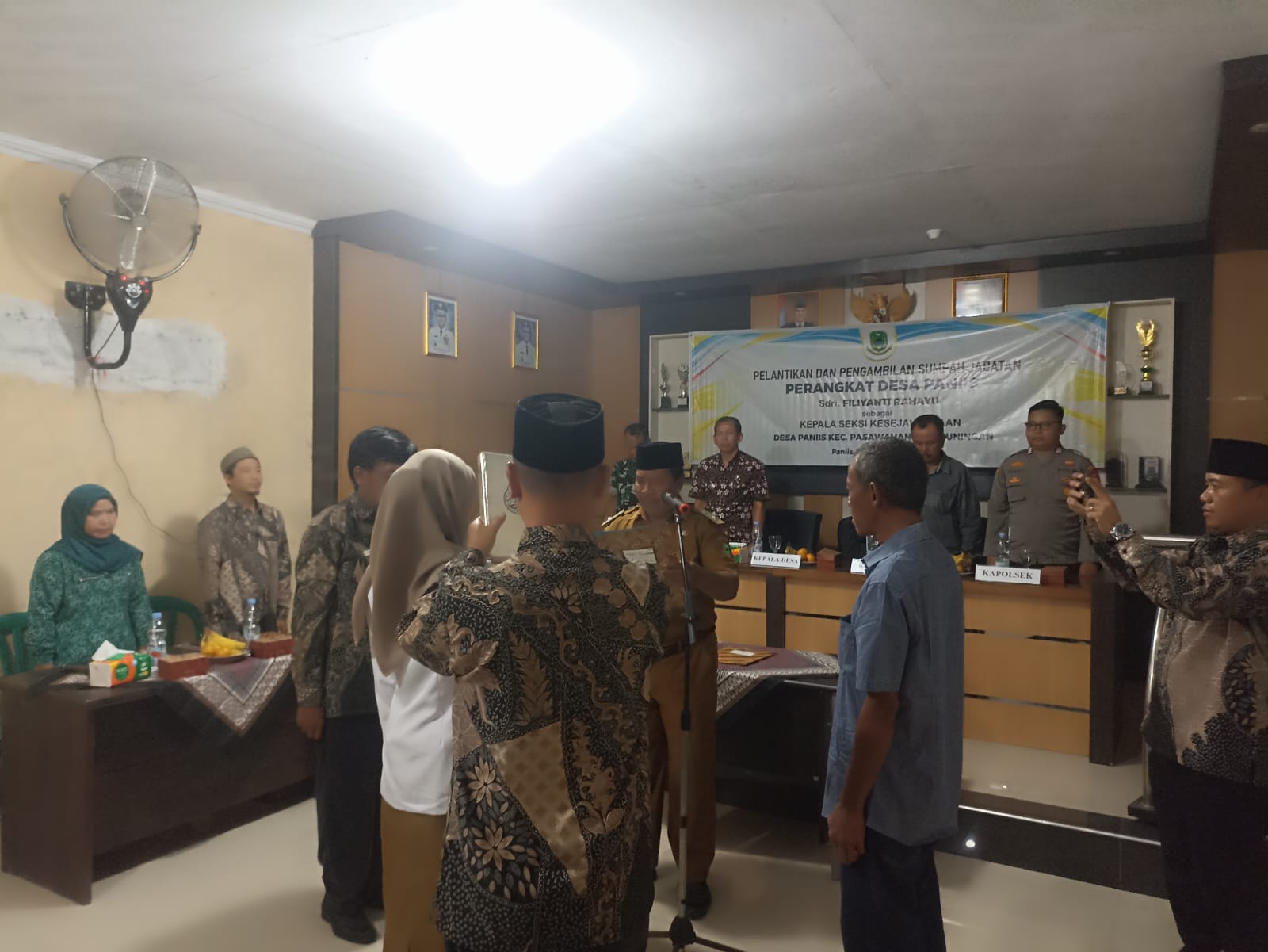 Kuningan, Jum’at (12/09/2025) – Pemerintah Desa Paniis, Kecamatan Pasawahan, Kabupaten Kuningan, menggelar kegiatan Pengambilan Sumpah Jabatan dan Pelantikan Perangkat Desa bertempat di aula balai desa. Acara dimulai pukul 13.30 WIB hingga 14.30 WIB dan berjalan lancar.