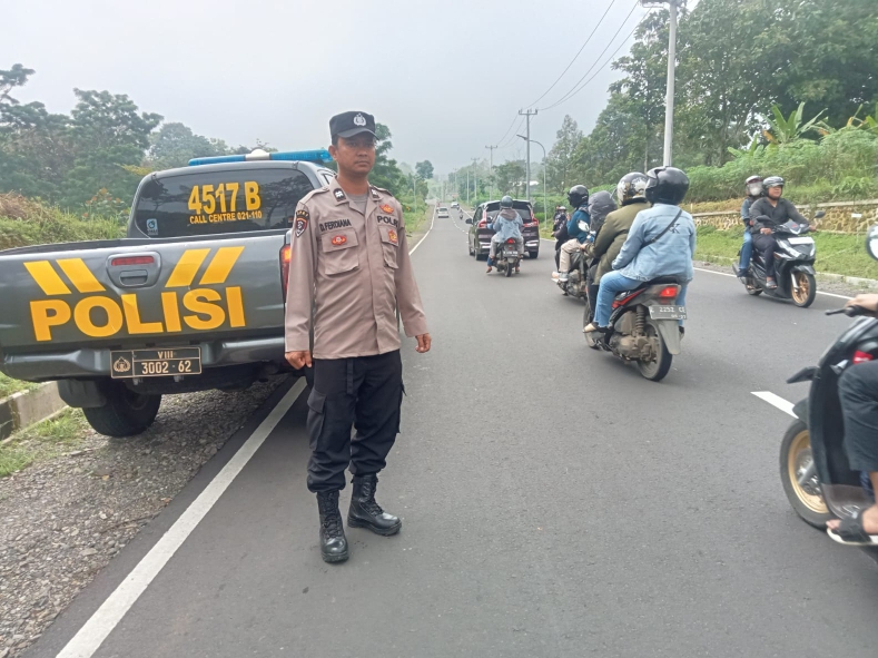 KASPKT 2 polsek Cigugur laksanakan pengaturan lalu lintas sore hari di jalan baru Cipari antisipasi kemacetan