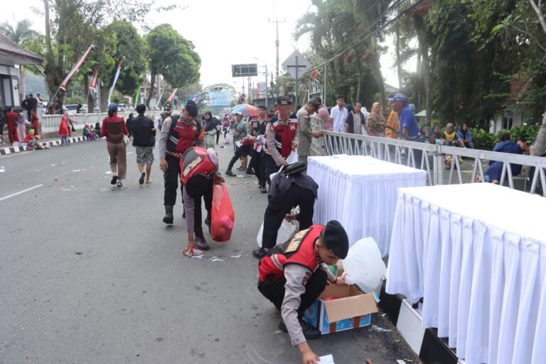 KUNINGAN – Usai pelaksanaan acara Tradisi Babarit Hari Jadi Kuningan ke-527, personel Polres Kuningan langsung melakukan aksi bersih-bersih di area sekitar lokasi kegiatan. Sampah dan material bekas acara dikumpulkan untuk memastikan kawasan tetap bersih, aman, dan nyaman bagi masyarakat, Minggu (24/8/2025).